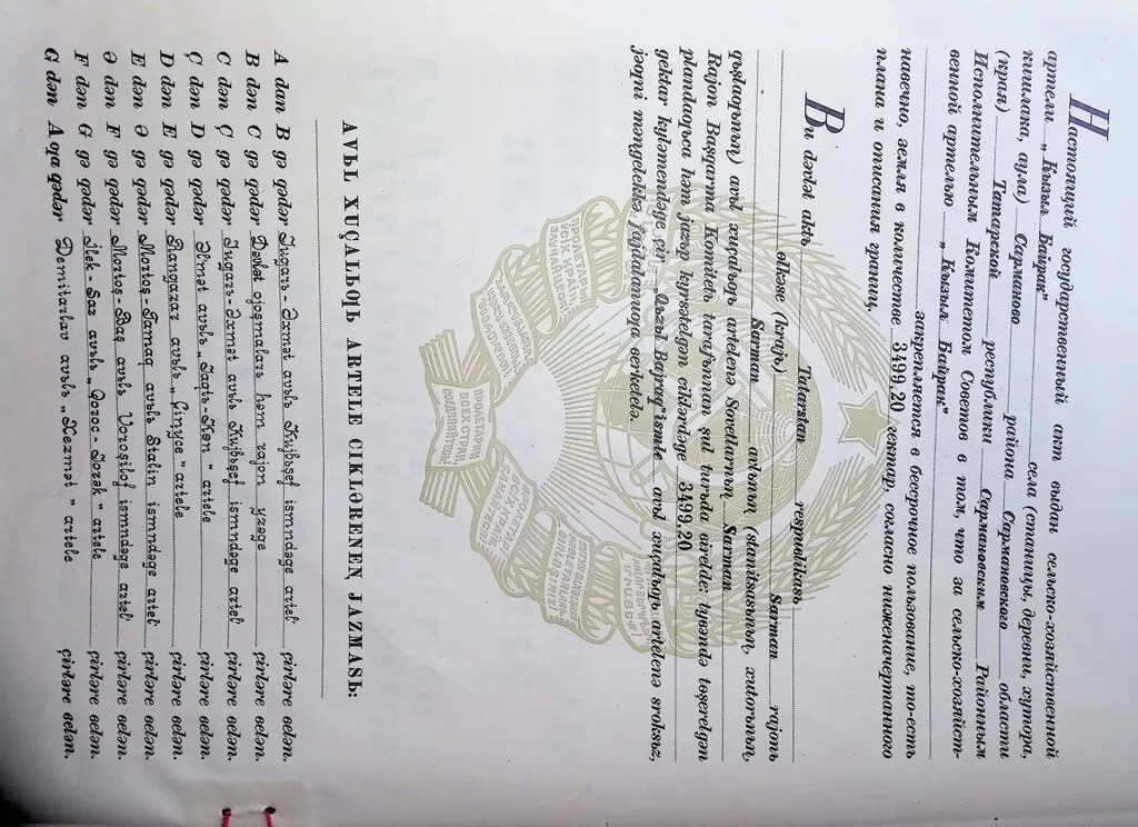 Текст из данного акта "Настоящий государственный акт выдан сельскохозяйственной артели «Кызыл Байрак» села Сарманово Сармановского района Татарской республики Сармановским районным Исполнительным комитетом в том, что за сельскохозяйственной артелью закрепляется в бессрочное пользование, то есть навечно, земля в количестве 3499,20 гектар, согласно ниже начертанного плана и описания границ".